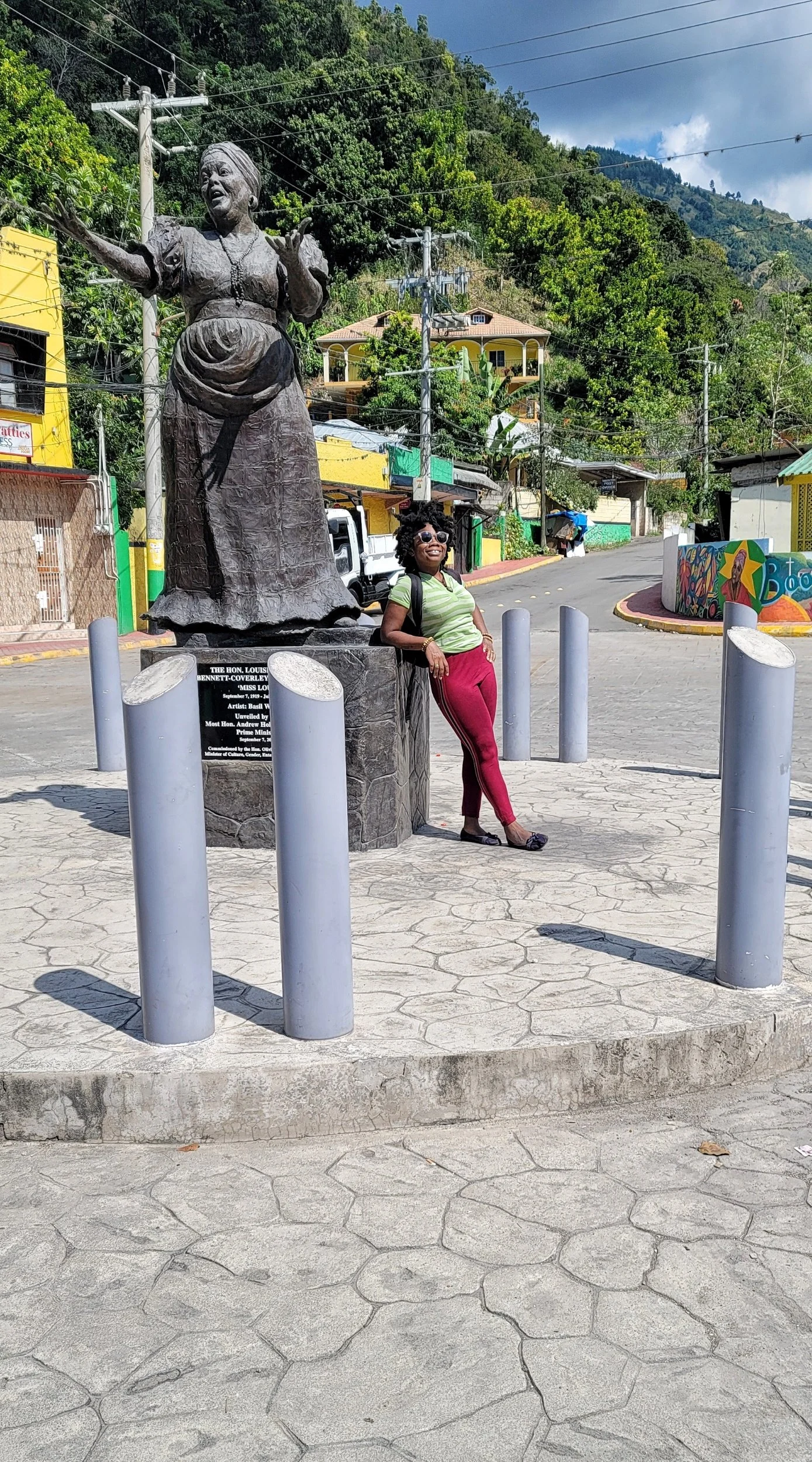 Posing beside Louise Simone Bennett-Coverley or Miss Lou, OM, OJ, MBE (7 September 1919 – 26 July 2006), was a Jamaican poet, folklorist, writer, and educator.
